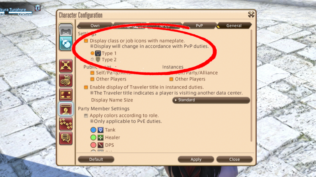 You can choose to display which job someone is playing with an icon next to their name. To do this, open Character Configuration and navigate to Display Name Settings. Once there, select the General tab and right at the top, select the “Display class or job icons with nameplate”.