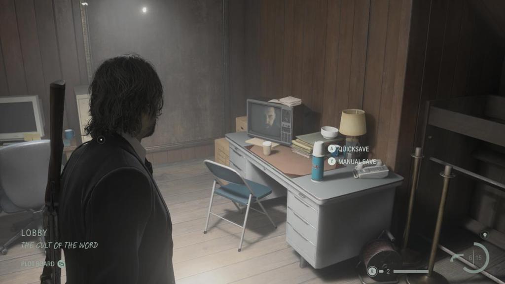 Your first collectible is dropped into your greedy hands the moment the chapter begins. After the break, the last Writer’s Journey, ‘Drowning’, pays out, allowing you to soak in Alan Wake in all his unhinged glory. Once the discomfort subsides, leave the room via the door on the right of the screens.