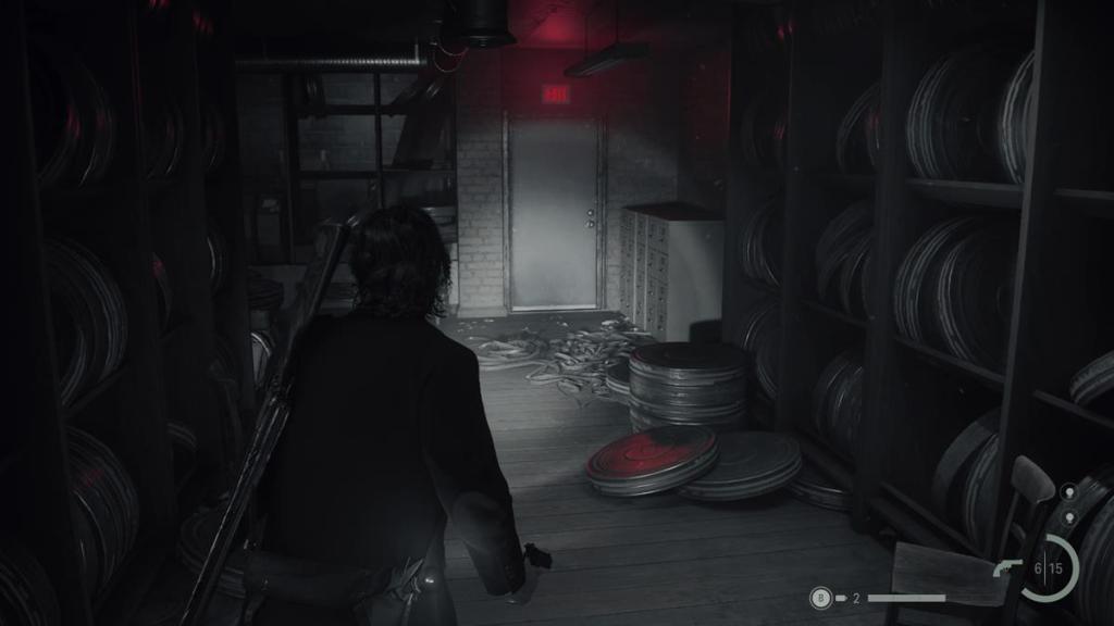 You’ll find yourself in a film storage maze, but it’s thankfully not too hard to navigate. For the most part, the maze is fairly linear, requiring only some additional direction along the way. Walk forward and enter the storage room. Locate a door leading to the Projection Booth. Leave the booth via the exit door.