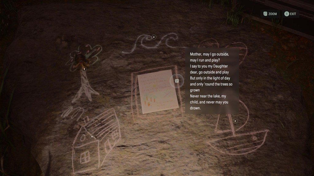 There are five Nursery Rhyme locations at Cauldron Lake. One of which isn’t accessible until you get the bolt cutters during the chapter, Return 5: Old Gods. The other is the final challenge and isn’t available until you complete all other Nursery Rhymes.