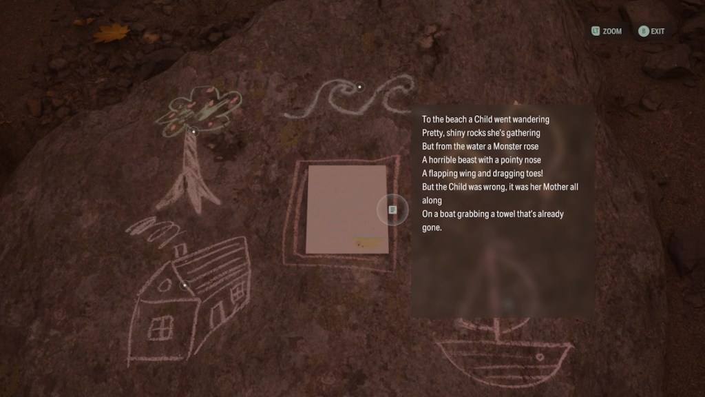 The final Nursery Rhyme location in Watery can’t be accessed until you get the bolt cutters in the chapter Return 5: Old Gods. With the tool in hand, head back to the Lighthouse Trailer Park and unlock the gate outside of the trailer across the way from “Saga’s trailer.” Find the nursery rhyme in the bedroom, surrounded by hay.