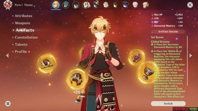 If you’re building Burgeon Thoma but find that his shields break too easily, try switching one of your artifacts to an HP main stat. It will result in less Burgeon damage, but you might prefer the comfort of stronger shields.