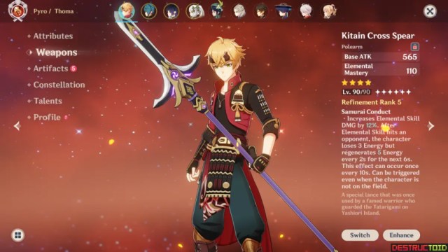 Thoma can require upwards of 190% Energy Recharge. Prior to Constellation 4, his Energy needs are much higher, making him nearly unusable without Kitain Cross Spear or another Pyro character in your team. His Energy needs can vary quite a lot depending on his team, so it may take some experimentation to find what works for you.