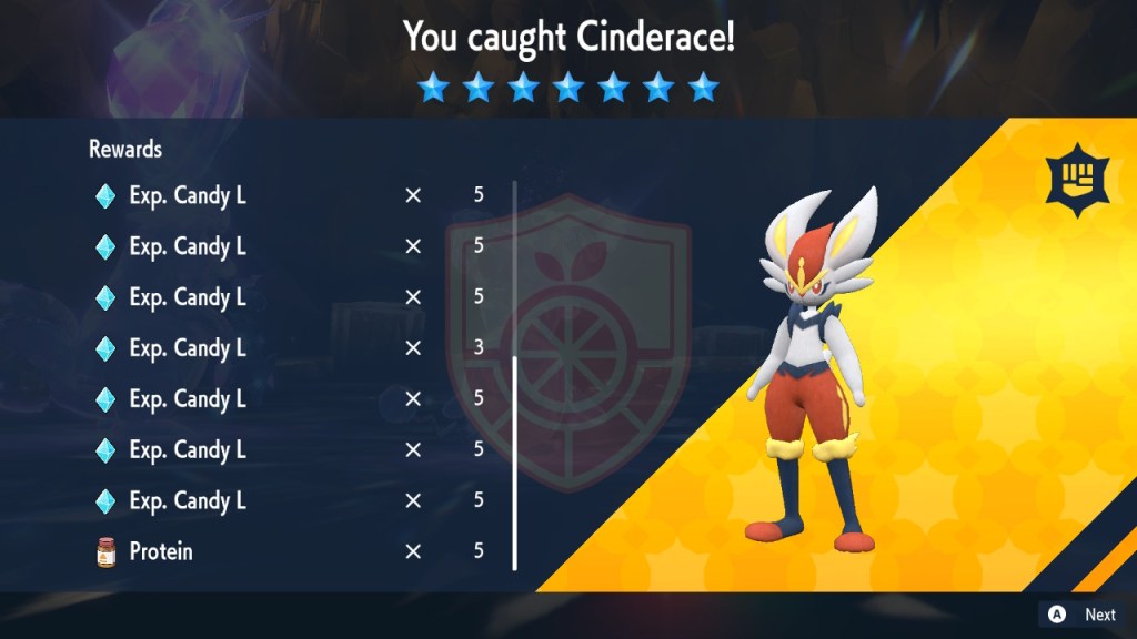 As promised ahead of launch, this Cinderace is a fighting Tera type (which can be changed), and is a fire type normally. Clocking in at level 100, the 7-star Cinderace came with the following moves (and the Libero ability):