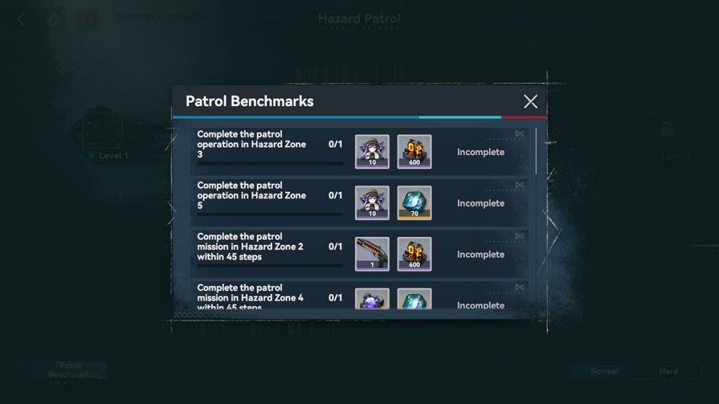 | Complete the patrol mission in Hazard Zone 4 with 45 steps | 1x Basic Info Core 70x Collapse Piece |