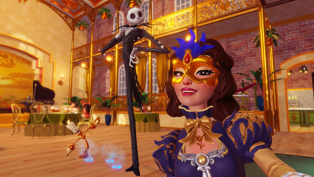 Once you have all of the materials in your inventory, head back to Tiana’s Palace and talk to Jack to give them to him. He applies the spell to your Masquerade Mask, allowing you to see if the strange events are related to the Here and There. Put on the mask to start searching.