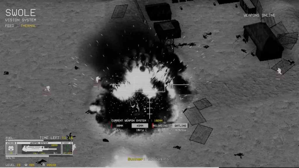 If you were skilled (or lucky) enough to nab an AC-130 killstreak in MW2 back in the day, the gameplay will immediately feel familiar to you. You fly high above a battlefield, defending your interests from invading soldiers and vehicles while cycling through a variety of weapons that you unlock by playing the game as you would any roguelite, leveling up and earning new and improved skills.