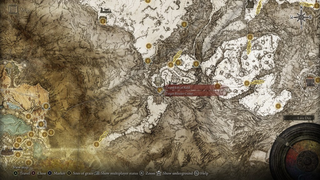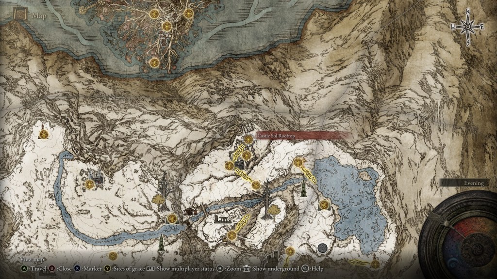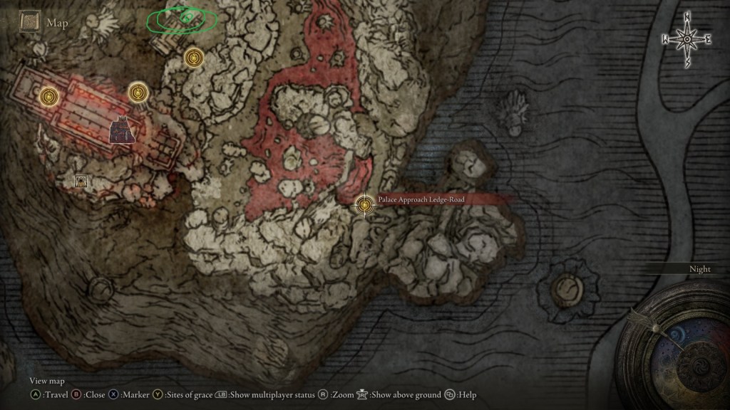 This will warp you to Moghwyn Palace, Mohg’s underground headquarters. You’ll land on the Palace Approach Ledge-Road site of grace, and won’t get the map below to guide you. My recommendation is that you call Torrent and just move toward the spot I marked in green. The enemies between you and that site might look daunting, but I doubt you’ll have much trouble getting there.