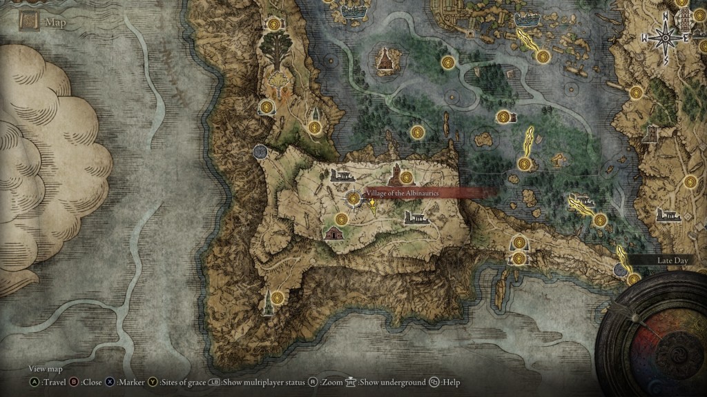 You’ll find it just a bit to the west of the site of grace there, but there’s a trick. To get it, you’ll need to hit a pot that’s actually the last Albunauric trying to go unnoticed. Attack it once, and he’ll show up to give you the medallion. He’ll be at the higher corner of the village, more or less where you see this Erdtree flower in my game.
