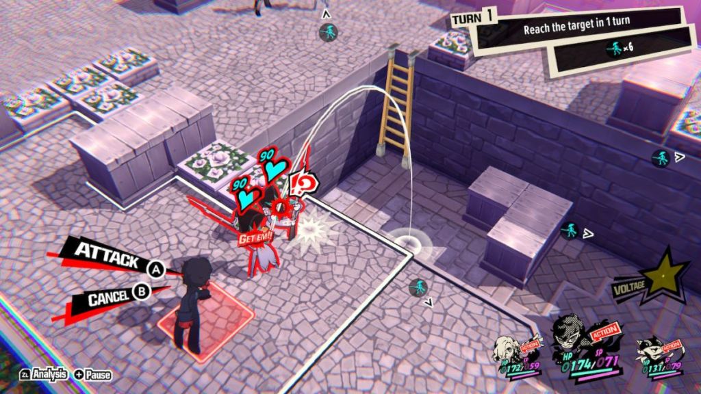 Once the farthest enemy has been sent flying into the center, take control of Erina. Start with the nearby enemy you should’ve left cowering in the center, and start moving and shooting your way forward. Quest 2 in Persona 5 Tactica is all about mastering this chained movement, and serves as a good warm-up for later challenges.