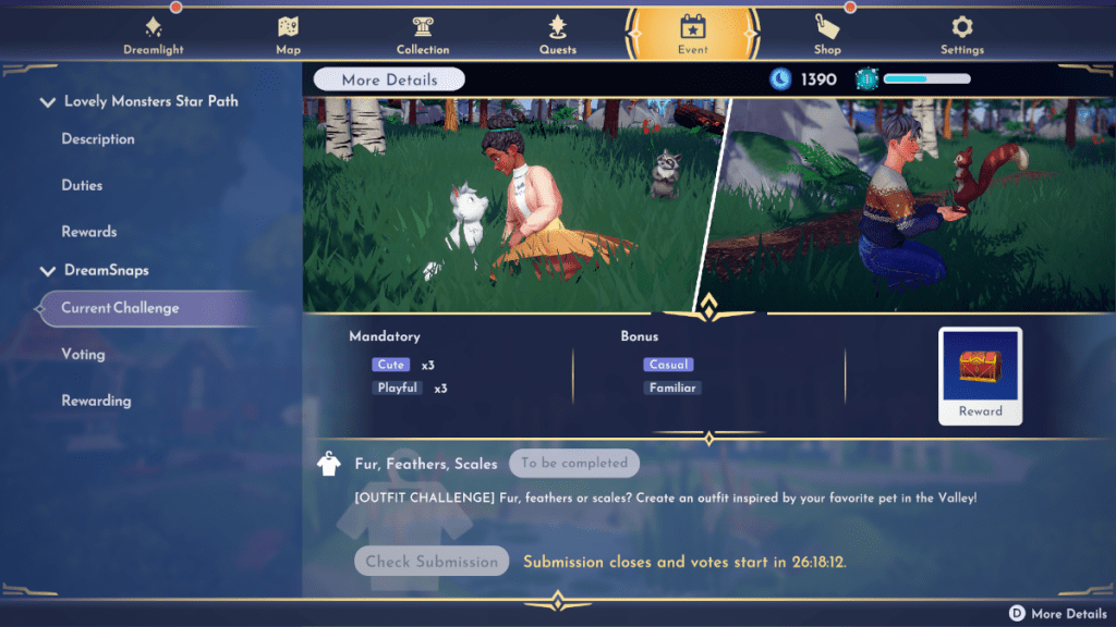 At the time of writing, the current challenge is called ‘Fur, Feathers and Scales’. This is an outfit challenge, requiring players to wear three cute-type items and three playful-type items in a photo inspired by their favorite pet in the Valley.