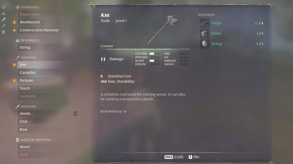 Food isn’t the only thing you can craft in Enshrouded. You can also make an axe to protect you from the dangers that lurk, but preferably it’s reserved for cutting trees.