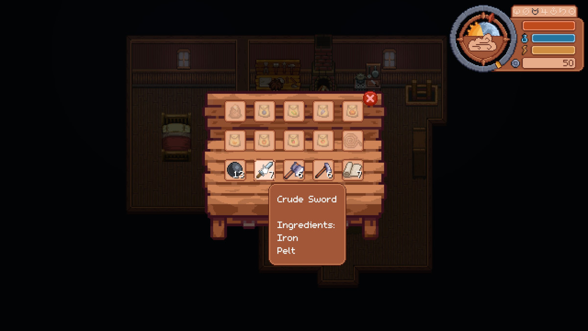 Once you’ve got these, head back to your house and head to the crafting table. Click on it to open the crafting menu. Dreaming Isles’ crafting system is easy to understand; just hover over the tool or weapon you want to build and click its icon. The game even tells you how many of each item you can craft based on how many materials you have.
