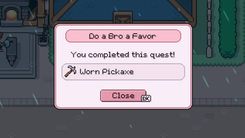 To get a Pickaxe, you’ll need to pick up a quest from the Request Board in town. The quest you need is called ‘Do a Bro a Favor’, and simply requires you to head to the Blacksmiths and talk to Olric. When you speak to him, he’ll give you an Worn Pickaxe which you can then use to mine any small rock and get between one and two Stone.