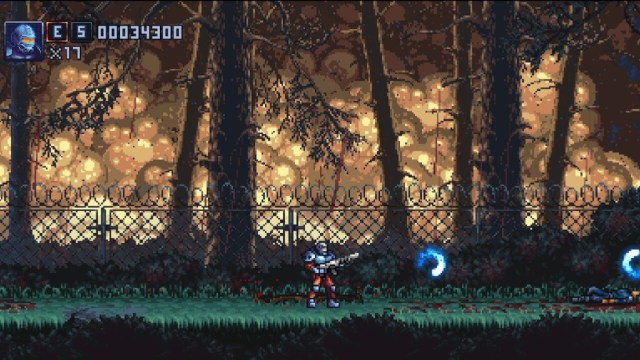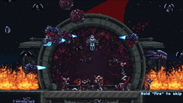 Stage 2 pits Vadim against Carrionvoy, which takes a long and winding train and turns it into a hideous beast that barfs up corpses. It’s also a pretty straightforward fight, but its various attacks and the way it slithers back and forth, filling the screen all the while, shows more of what Iron Meat has up its sleeves. The level itself is great, too. It takes place atop a train, pulling the camera out to show the bigger picture and make it easier to see all the attacks coming your way. It all goes down to a soundtrack that’s more Doom than Contra, but it works well with all the splatter on display.