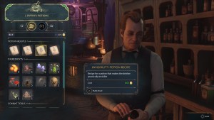 The potions shop can be found tucked away in the northwest corner of Hogsmeade. Once you unlock the town of Hogsmeade through the main questline (fairly early, in the first few hours) you can visit J. Pippin’s Potions shop and buy its wares. J. Pippin sells recipes for potions, ingredients for potions, and a selection of potions themselves.