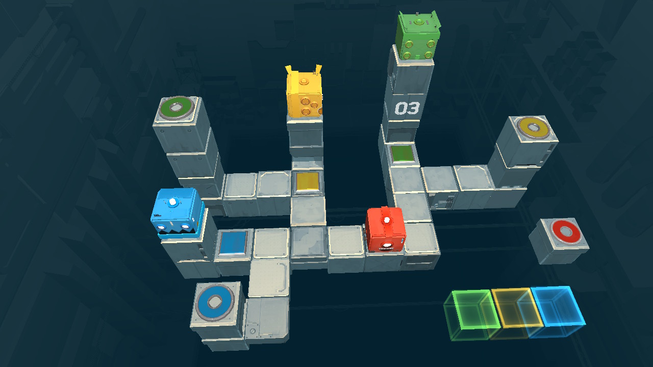 Death Squared has a pretty simple concept at its core. You control two to four colorful, cubical robots and have to get each of them to their goal marker without letting any of them die. Robots can trigger buttons matching their color, and these can open paths, alter the level layout, and/or trigger additional hazards that must be avoided on the way to the goal.
