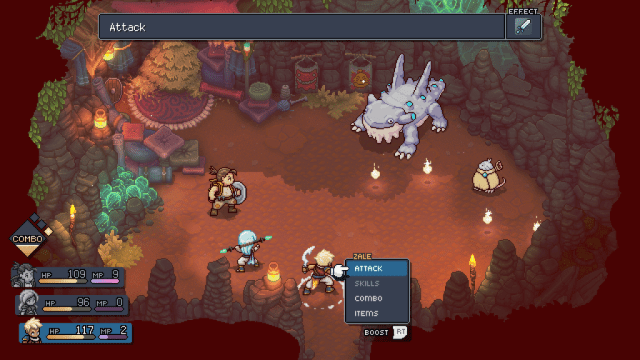 Sea of Stars certainly plays better in that regard, but I don’t, and it doesn’t matter. The traditional turn-based combat concepts I get, no problem. There’s flashy combo attacks, and its Lock system that roulettes its way through different damage types, indicating which you’ll need to utilize against enemies to break their cast. Those pieces clicked, but I’m absolutely terrible with the game’s trigger mechanic.