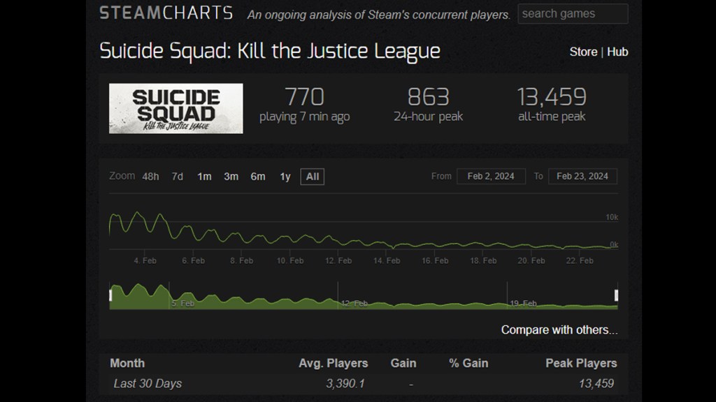 According to Steam Charts, the player count on Steam has been in a steady decline since its release with a peak of 13,459 on February 3, 2024, and a current player count of 770 at the time of this writing. While we have no accurate way to measure the player base on consoles, the data we do have paints a grim picture.
