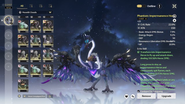 To further boost her supporting capabilities, our main echo pick will be Impermanence Heron. After being used, the echo will allow her to also offer a 12% Damage Bonus buff to the character taking the field. I then recommend that you pair our main pick with two elites and two common echoes in a 4-3-3-1-1 composition.