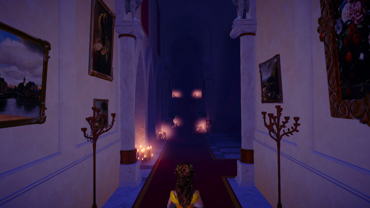 It’s time to put the strange painting back where it belongs. Head over to the piano right by the Realm entrance and approach the swirls and rose petals on the wall right behind it to place the flying painting.