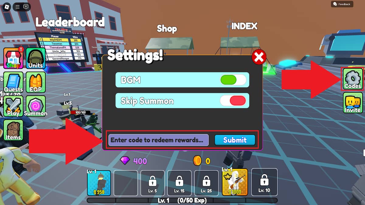 How to redeem codes in Trench War Tower Defense