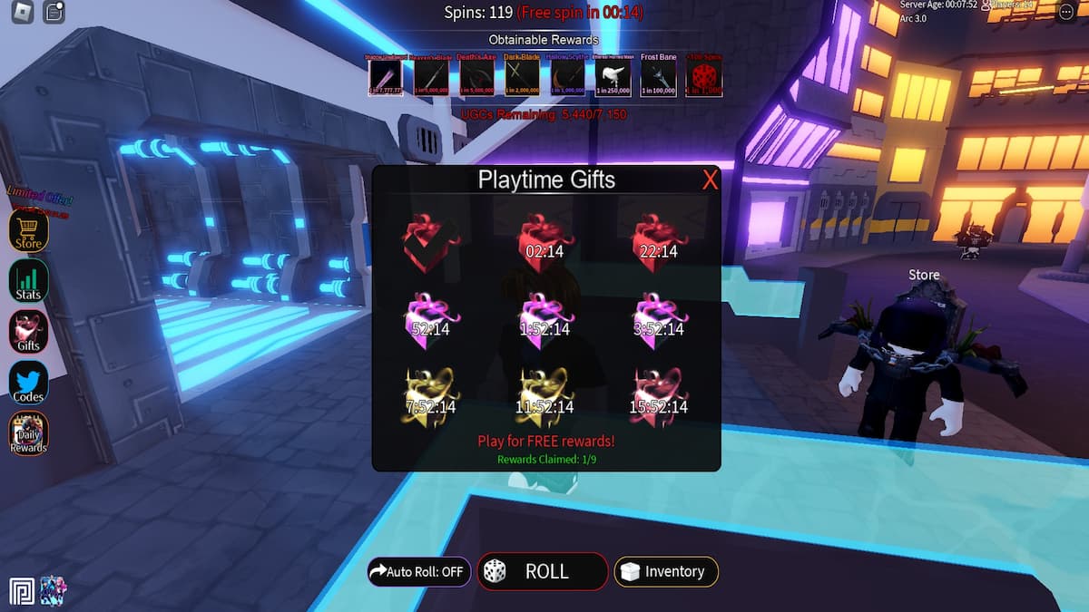 Besides UGC RNG codes, you can claim more free goodies through the Playtime Gifts menu on the left side of the screen. If you stay logged in for up to 16 hours, you’ll be able to redeem up to nine free rewards, which include spins and UGCs. You can also visit the Daily Rewards menu and claim up to 10 free items after logging in 10 days in a row. Finally, you’ll receive a free spin for every 30 seconds you spend in the game.